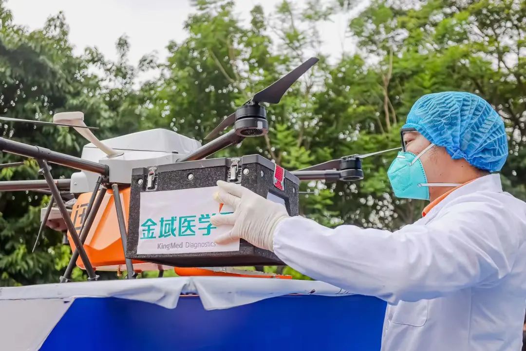 一架載著生物樣本的多旋翼無(wú)人機(jī)從廣東省第二人民醫(yī)院(廣東省應(yīng)急醫(yī)院)緩緩起飛,飛到90米的高空后,隨即以50km/h的最高時(shí)速,10分鐘飛抵廣州國(guó)際生物島上的金域醫(yī)學(xué)總部...