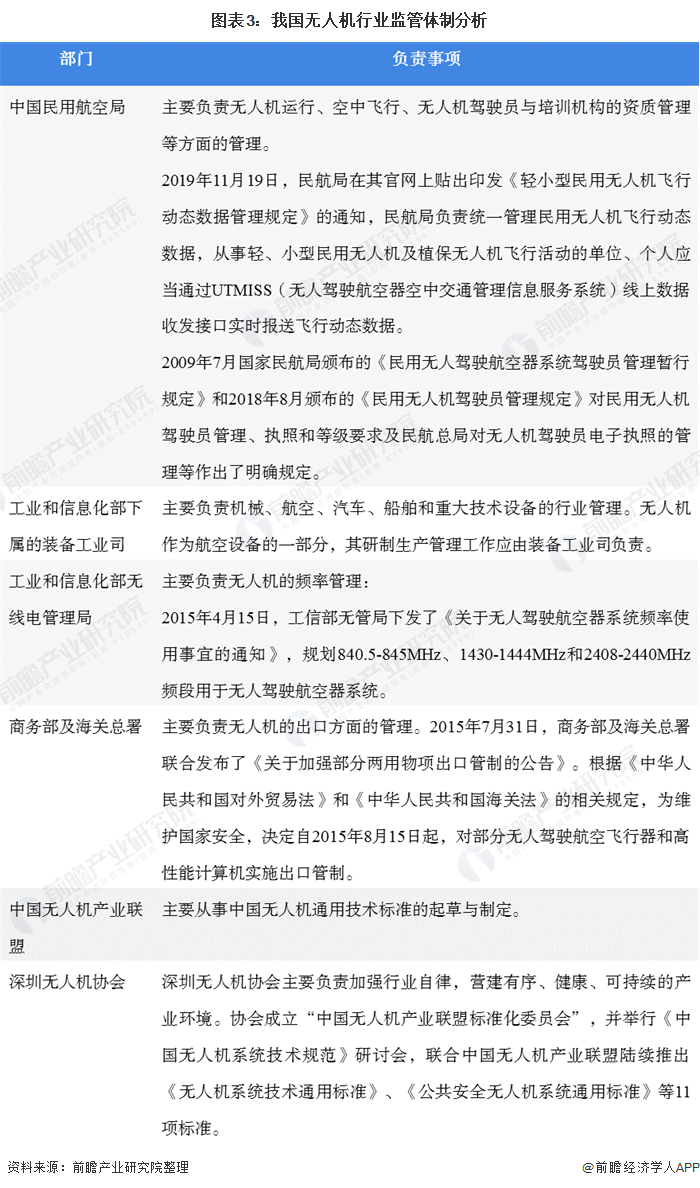 近年來,我國無人機行業進入快速發展階段,民用無人機更是連續三年保持超過50%的增長率,表現亮眼。基于5G、人工智能、物聯網和大數據等的技術力量的變革和下游應用市場需求的持續爆發,更是給行業發展帶來巨大的想象力。然而,與行業快速增長相對于的是監管政策的相對落后,無人機未經許可闖入公共及敏感區域、意外墜落、影響客機正常起降、碰撞高層建筑等“黑飛”事件時常發生,給社會正常生產生活秩序與居民人身安全帶來一定的威脅,相應的隱私問題也引起了相關關注,種種現象表明,加強無人機監管以引導行業健康有序可持續發展勢在必行。目前,我國無人機的研制、銷售、使用與出口相關管理部門主要包括中國民用航空局、工業和信息化部、商務部及海關總署、中國無人機產業聯盟和深圳無人機協會等。