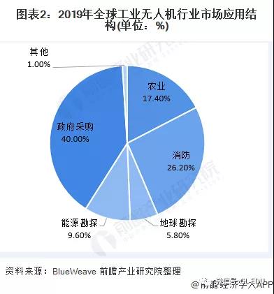 根據BlueWeave公布的數據顯示,當前全球工業無人機行業中政府采購占比最高,為40%;其次為消防應用,占比為26.2%;農業應用占比為17.4%,能源勘探和地球勘探占比分別為9.6%和5.8%。