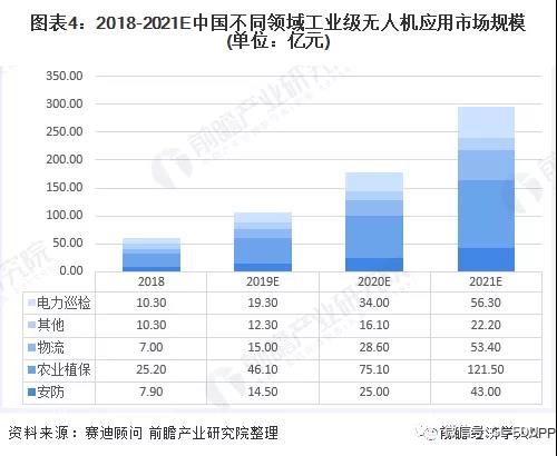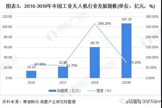而從2019年起,農業植保、安防巡檢等領域的市場需求充分釋放,市場成熟度也將進一步提高,工業級無人機市場規模保持高速穩定增長,初步估算2019年市場規模為107.1億元,同比增長76.2%。