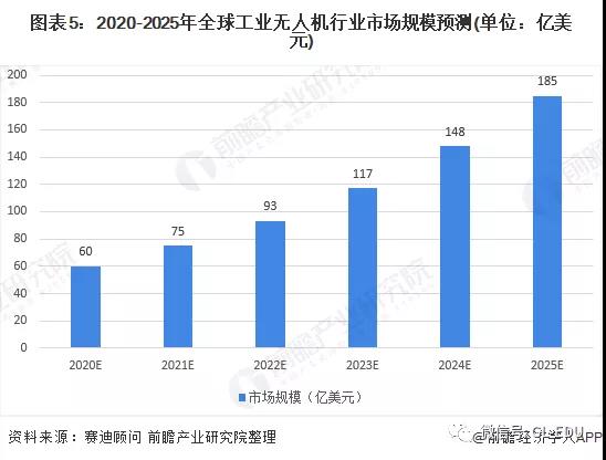 從全球看,根據賽迪顧問數據,未來五年全球工業級無人機市場將從2019年的48億美元增長至2024年的148億美元,年復合增速預計為25%。根據測算,2025年全球工業無人機市場規模將達到185億美元。